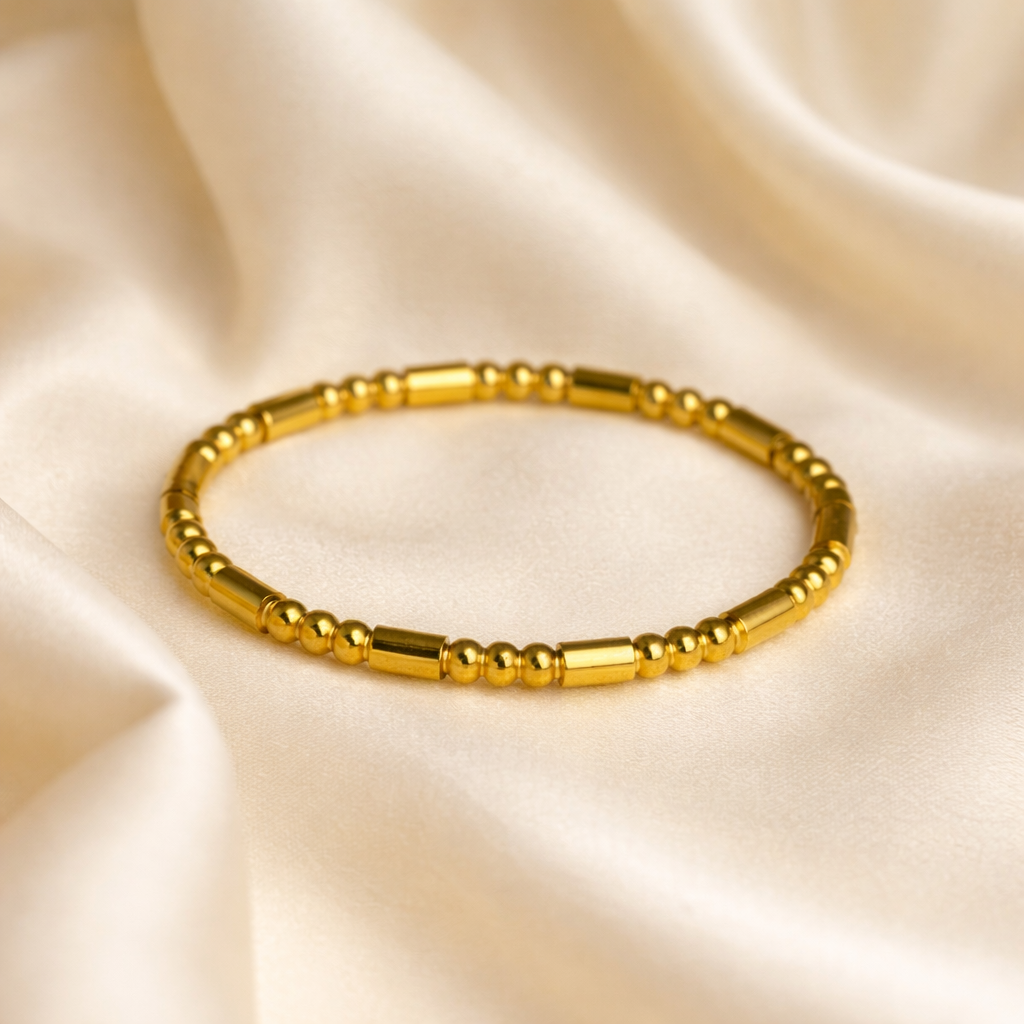 A sophisticated and modern take on traditional jewelry. This bangle features an alternating pattern of polished gold-toned spheres and smooth cylindrical bars, creating a refined geometric aesthetic. Designed for the modern woman, its minimalist silhouette makes it perfect for stacking or wearing alone as a subtle statement piece.